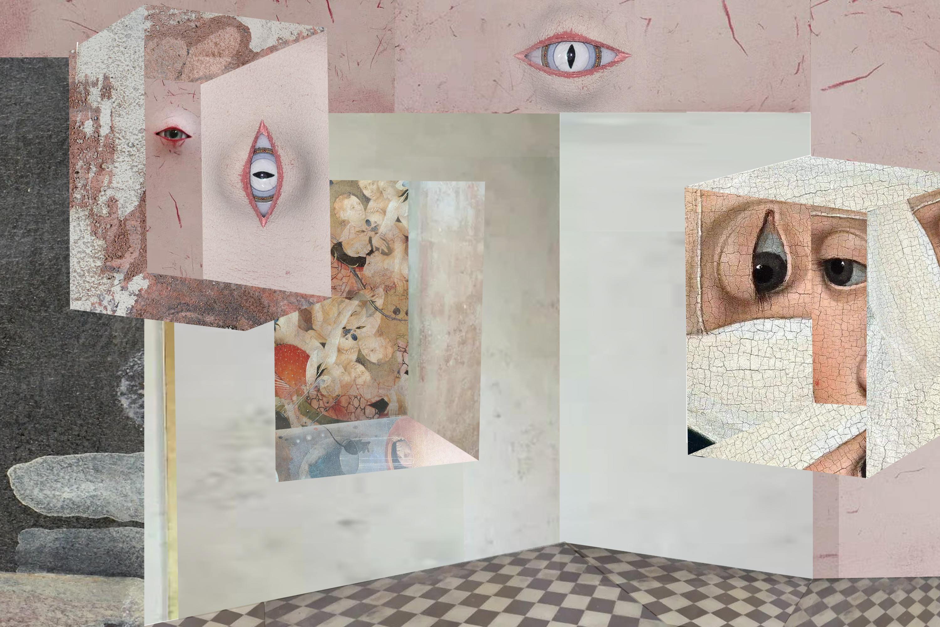 “Angelus Novus”一词概念引申自本雅明评保罗克利《新天使》,新天使面朝过去而背后是新事物之风暴,在此借以象征当下怀旧与迷新两种生活状态。图式可以是一种怀旧:画面中大量的眼睛旨在致敬超现实主义画家马格利特《错误的镜子》,窗台的图案来自博斯《人间乐园》,前人的图像时常在创作中被引用,但对此的组合是无可避免地冷静而秩序,画面中边缘线是锐利的,因为工业化的创作手法和新媒介入侵着生活的一切,甚